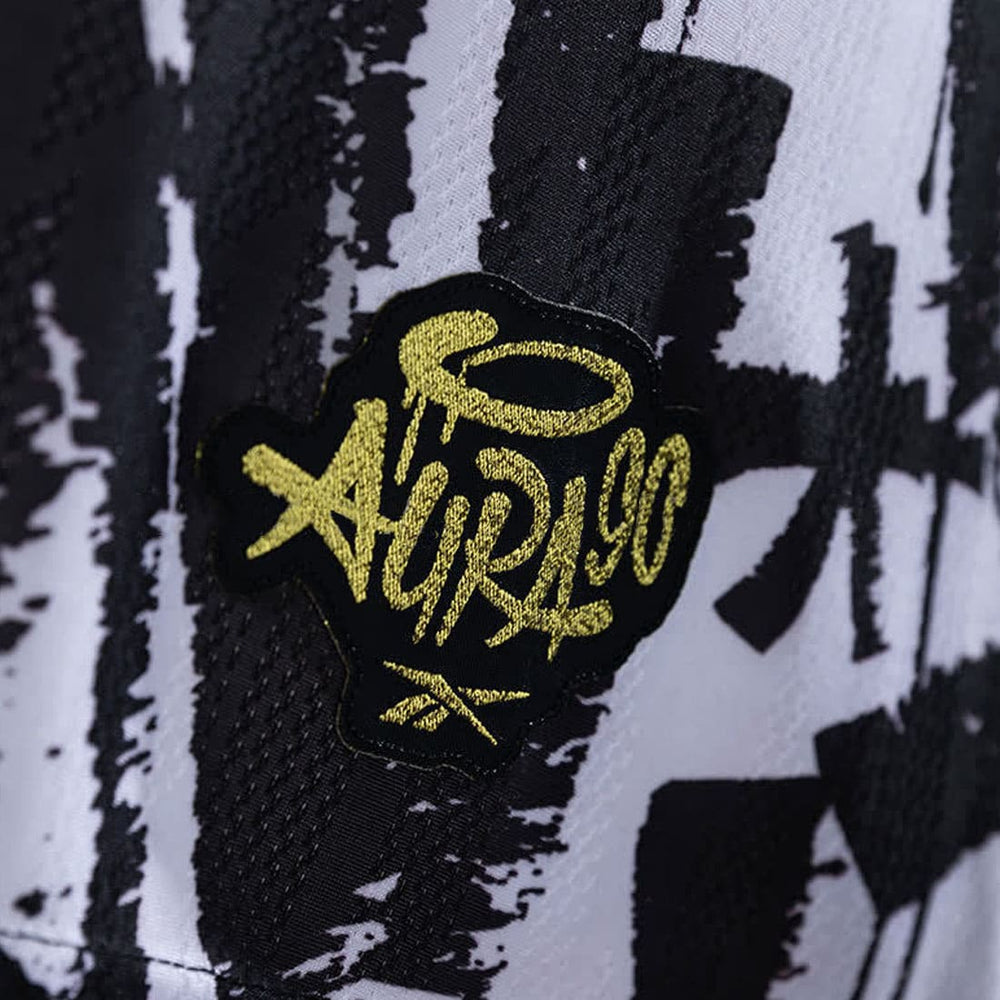 Com grafismos em preto e branco que remetem ao movimento urbano da época, a peça exibe detalhes exclusivos no escudo e no selo Reebok em dourado, reforçando a identidade e a elegância do manto. O famoso selo “Aura 90” aparece na barra, certificando a originalidade da coleção que resgata com perfeição a essência da década mais icônica da história do futebol.
