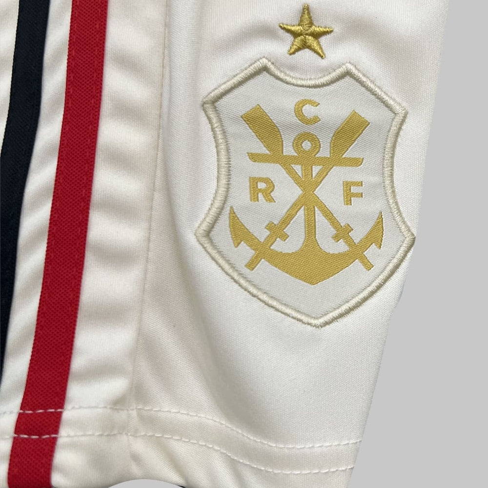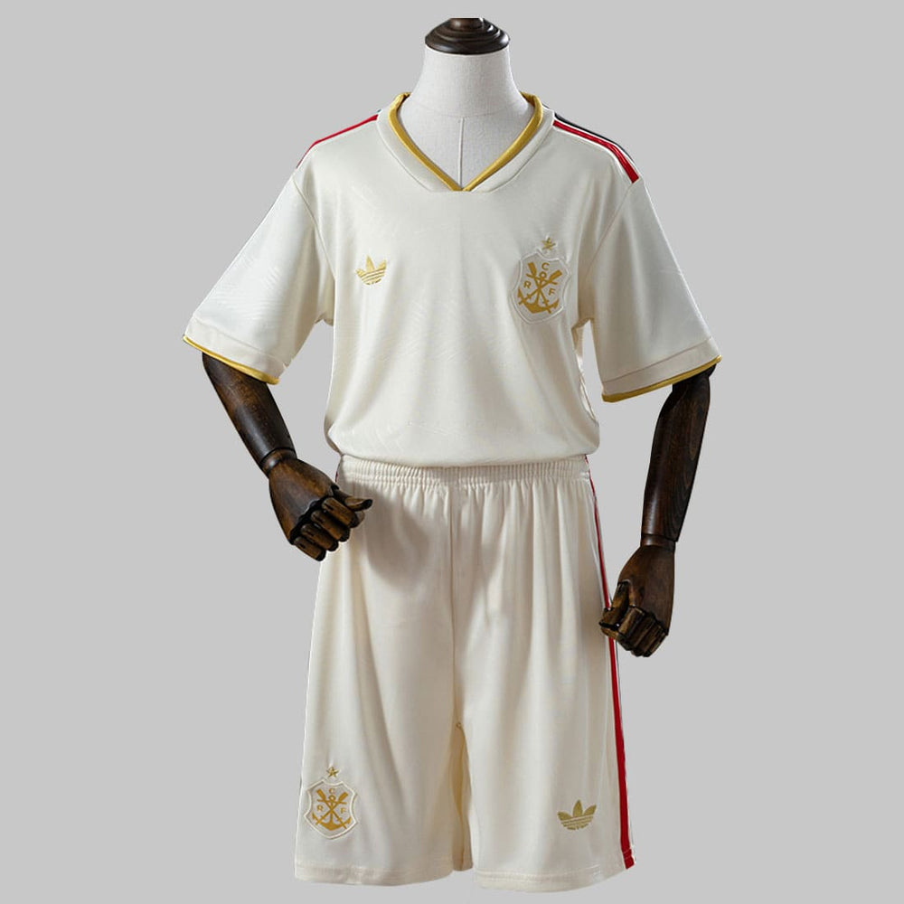 Inspirado no design do terceiro uniforme oficial, o conjunto traz tom bege clássico com detalhes dourados, remetendo à tradição e ao brilho dos 130 anos de conquistas do Flamengo.